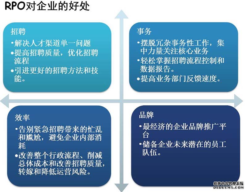 ??RPO服務屬于HRO(人力資源外包)的一種方式。企業將全部或部分招聘流程外包給專業公司來滿足招聘需求的過程,包括分析用人理念和職位需求、與用人部門主管溝通、區域及行業薪酬調查、信息發布、招聘渠道管理、簡歷篩選、考試測評、安排面試、背景調查、報到及試用期管理、建立企業人才備用庫等。也就是說,RPO 服務提供的是“End to End”的一站式服務。